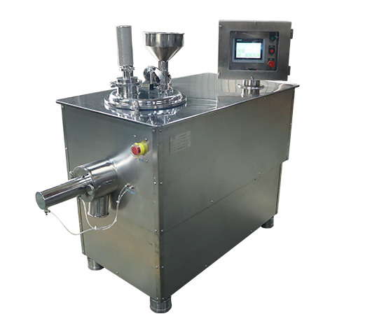 本機用于制藥工業(yè)中的固體制劑生產,集傳統(tǒng)制粒工藝中的混合和制粒兩道工序與一體同時進行,其制粒過程是先把粉料投入料筒內經攪拌漿形成翻滾狀態(tài),使不同性質的粉料得到徹底的混合,然后逐量加入粘合劑。(通過攪拌漿和筒壁對物料的擠壓、揉合,使其形成潮濕均勻的軟材,同時經制粒刀片的高速切割,逐步形成大小均勻的顆粒,最后由出料口排出,顆粒目數(shù)的大小由制粒刀的轉速和制粒時間控制)。